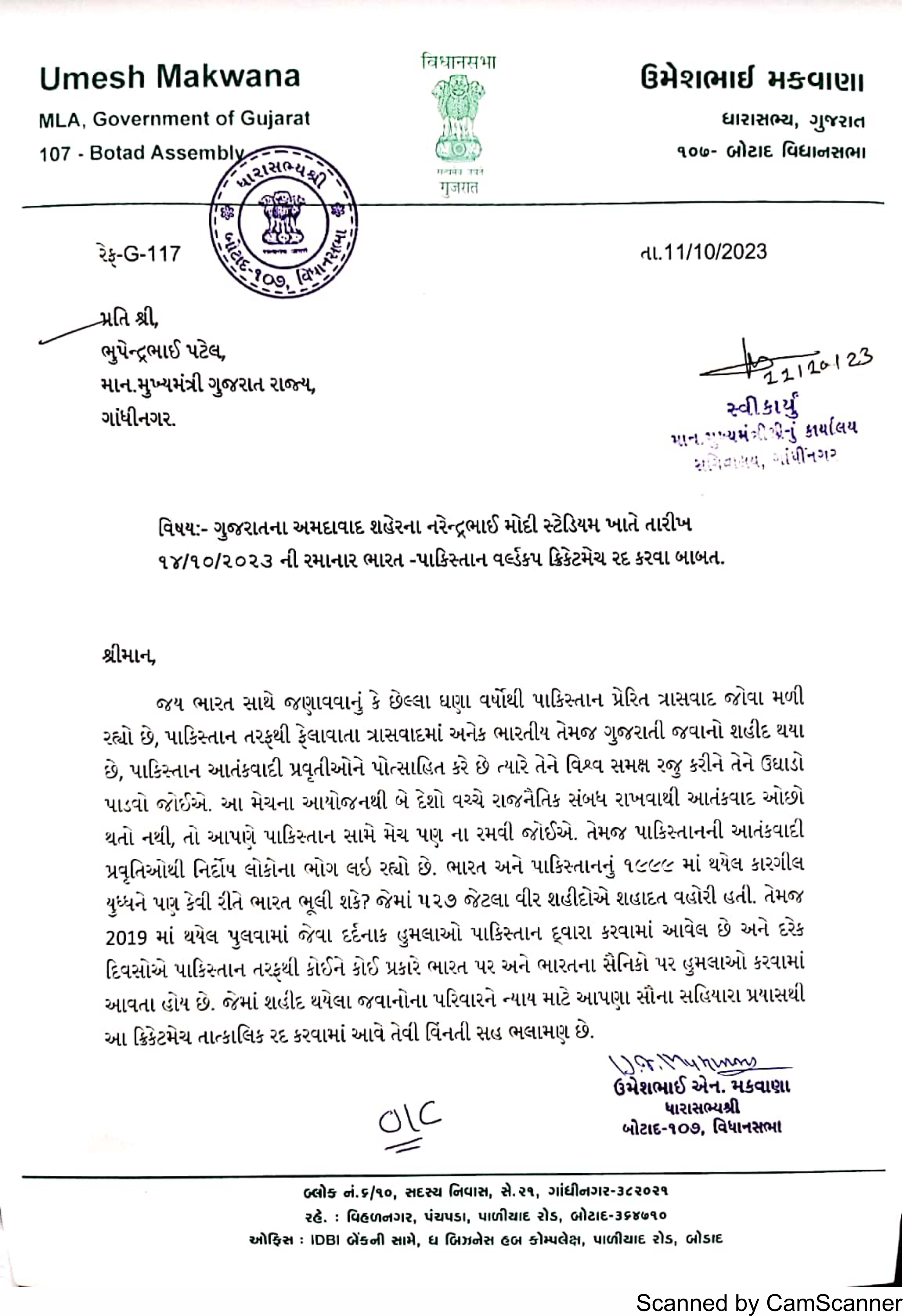 ગુજરાતના અમદાવાદ શહેરના નરેન્દ્રભાઈ મોદી સ્ટેડિયમ ખાતે તારીખ ૧૪/૧૦/૨૦૨૩ ની રમાનાર ભારત -પાકિસ્તાન વર્લ્ડકપ ક્રિકેટમેચ રદ કરવા માટે બોટાદ ધારાસભ્ય શ્રી ઉમેશભાઈ મકવાણા દ્વારા પ્રધાનમંત્રીશ્રી તેમજ મુખ્યમંત્રીશ્રી ને કરી રજૂઆત,