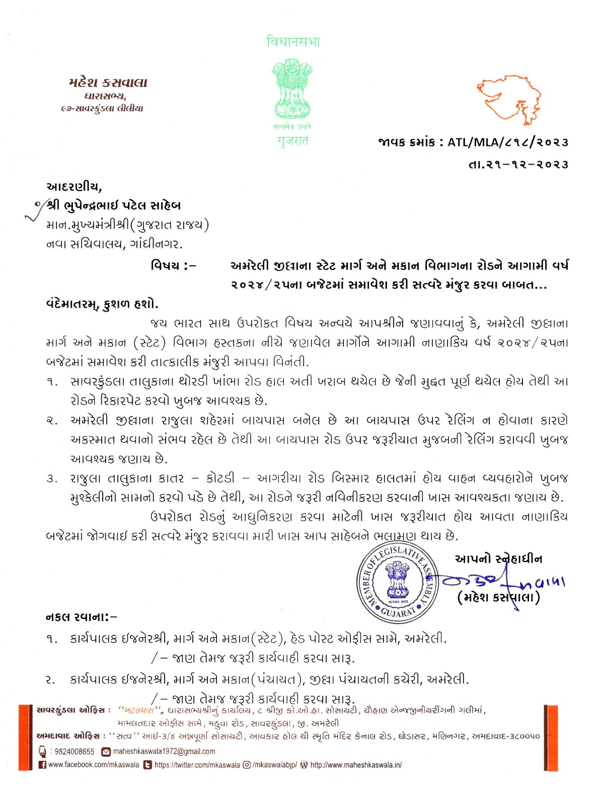 સાવરકુંડલા અને લીલીયા વિસ્તારમાં ચૂંટાઈને આવ્યા બાદ માત્ર પ્રજાના કામો અને વિકાસનો પર્યાય બનવા માટેનો અથાગ પ્રયત્ન સાથે કામની કુશળતામાં માહિર ધારાસભ્ય મહેશભાઇ કસવાળાએ આગામી બજેટમાં વધુ સાવરકુંડલા પંથકના રોડ રસ્તાઓ માટે આગામી 2024/25 ના બજેટમાં સમાવેશ કરીને માર્ગો રળિયામણા બને તે માટે ધારાસભ્ય મહેશભાઈ કસવાળાએ રાજ્યના મુખ્યમંત્રીશ્રીને પત્ર પાઠવીને રજુઆત કરવામાં આવી છે